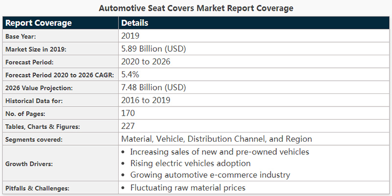 size valued at USD 5.89 billion in 2019 and will grow at a CAGR of 5.4% from 2020 to 2026. Rising consumer preference towards automotive interiors as well as increasing sales of new & preowned vehicles will positively influence market growth. Furthermore, its ability to retain vehicle value by protecting seats from wear, stain, and starches will significantly drive industry expansion.