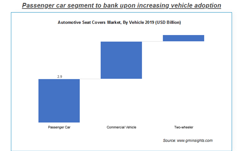 The passenger cars segment generated around USD 2.9 billion revenue in 2019 driven by escalating sales of new & preowned vehicles globally along with rapidly changing consumer preferences toward seat covers for better comfort & interior aesthetics. The foremost durability requirement of automotive seat covering is resistance to light, abrasion, stain, and UV radiation. However, ease of installation and maintenance of seat covers will propel market demand.